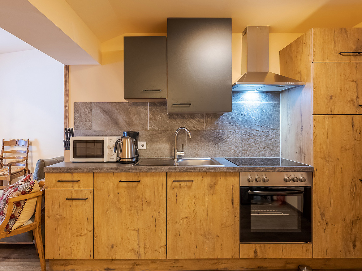 - Küchenzeile mit E-Herd, Backrohr, Mikrowelle, Kühlschrank, Küchen- und Kochutensilien, Geschirr, Besteck